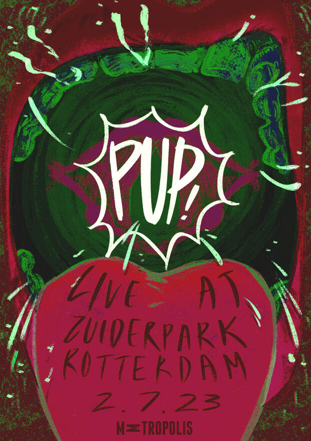 This poster was designed for Rotterdam's Metropolis Festival, a music festival featuring several indie bands. In particular, it represents the band, Pup. It was displayed at the venue.