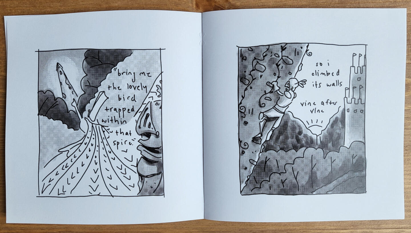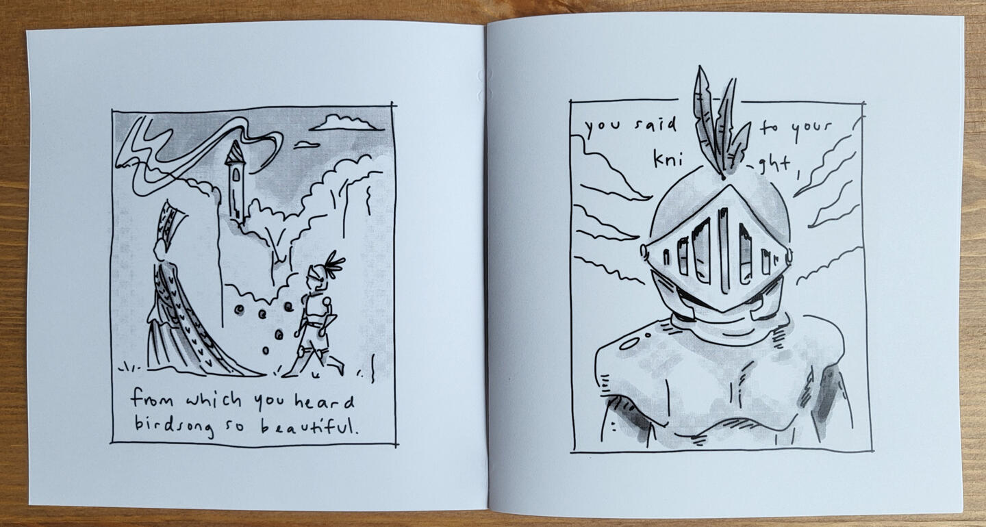 A short zine made in 2022. The first half consists of illustrations and single-page comics that build off of each other to create a story that leads into the second half, which is told through a typical page-by-page comic format. Exhibited at WDKA's Red Gallery in November of 2022.